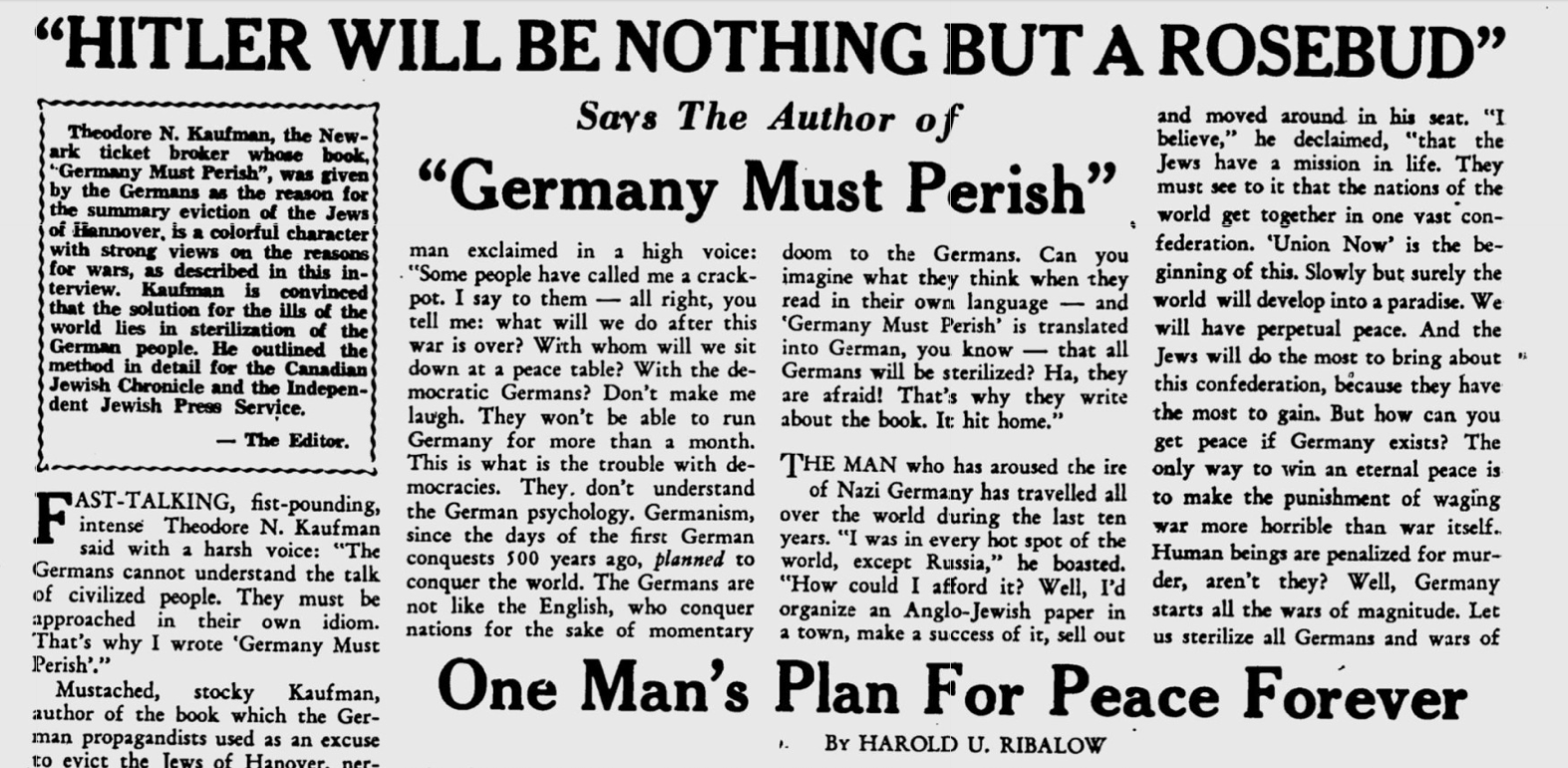 Another quote from the article: "The only way to win eternal peace is to make the punishment of waging war more horrible than war itself"
